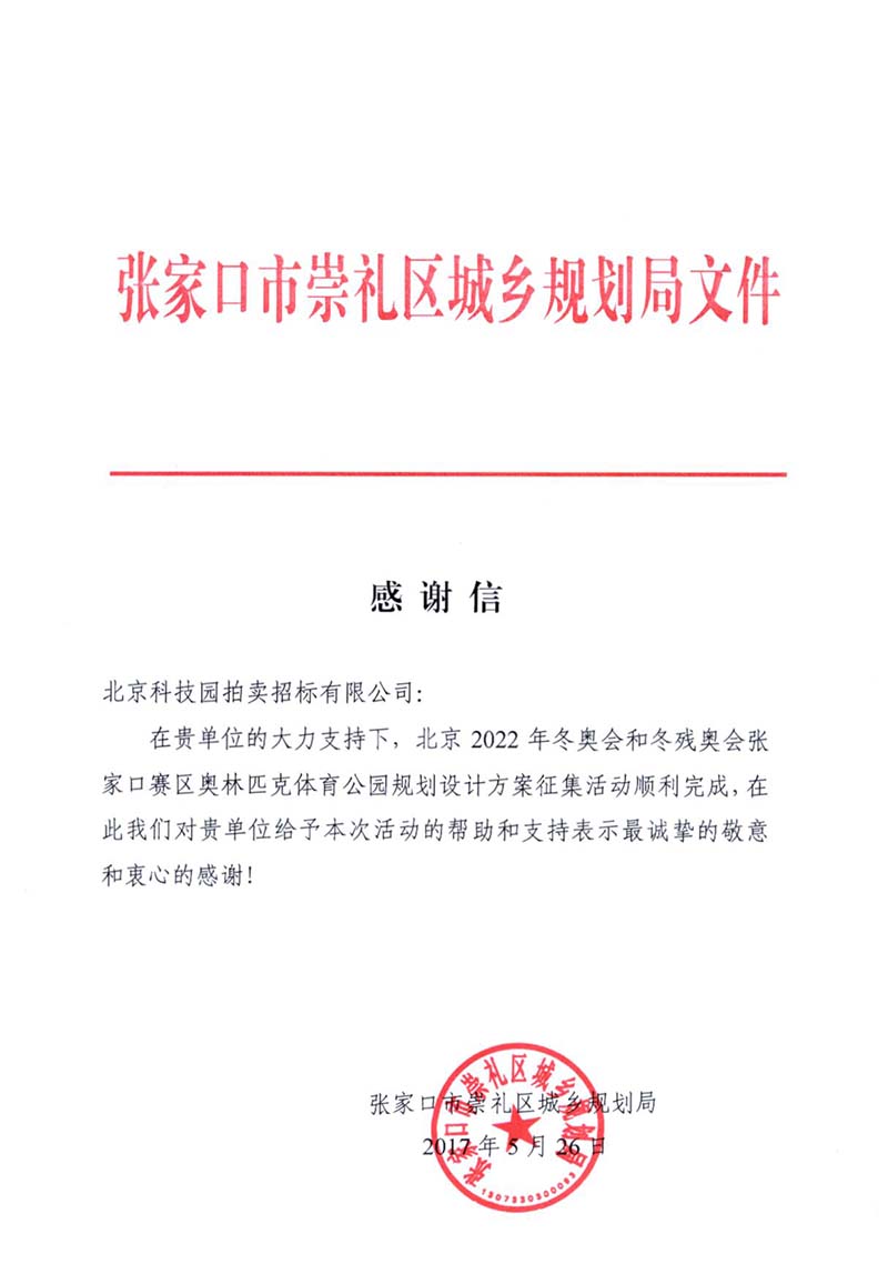 2022冬奧會和動殘奧會張家口賽區(qū)奧林匹克體育公園規(guī)劃設計方案征集感謝信