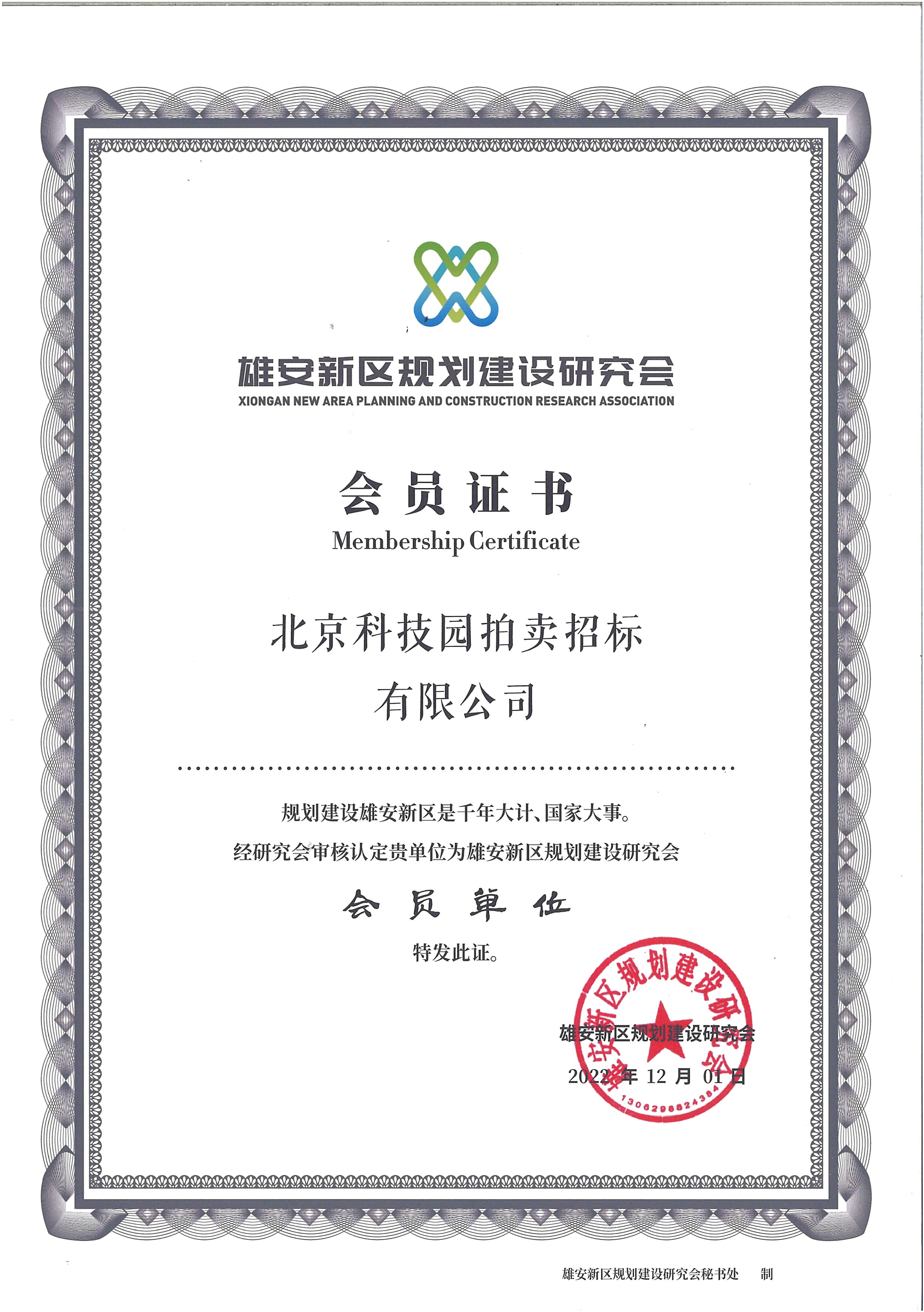 雄安新區(qū)規(guī)劃建設研究會會員證書