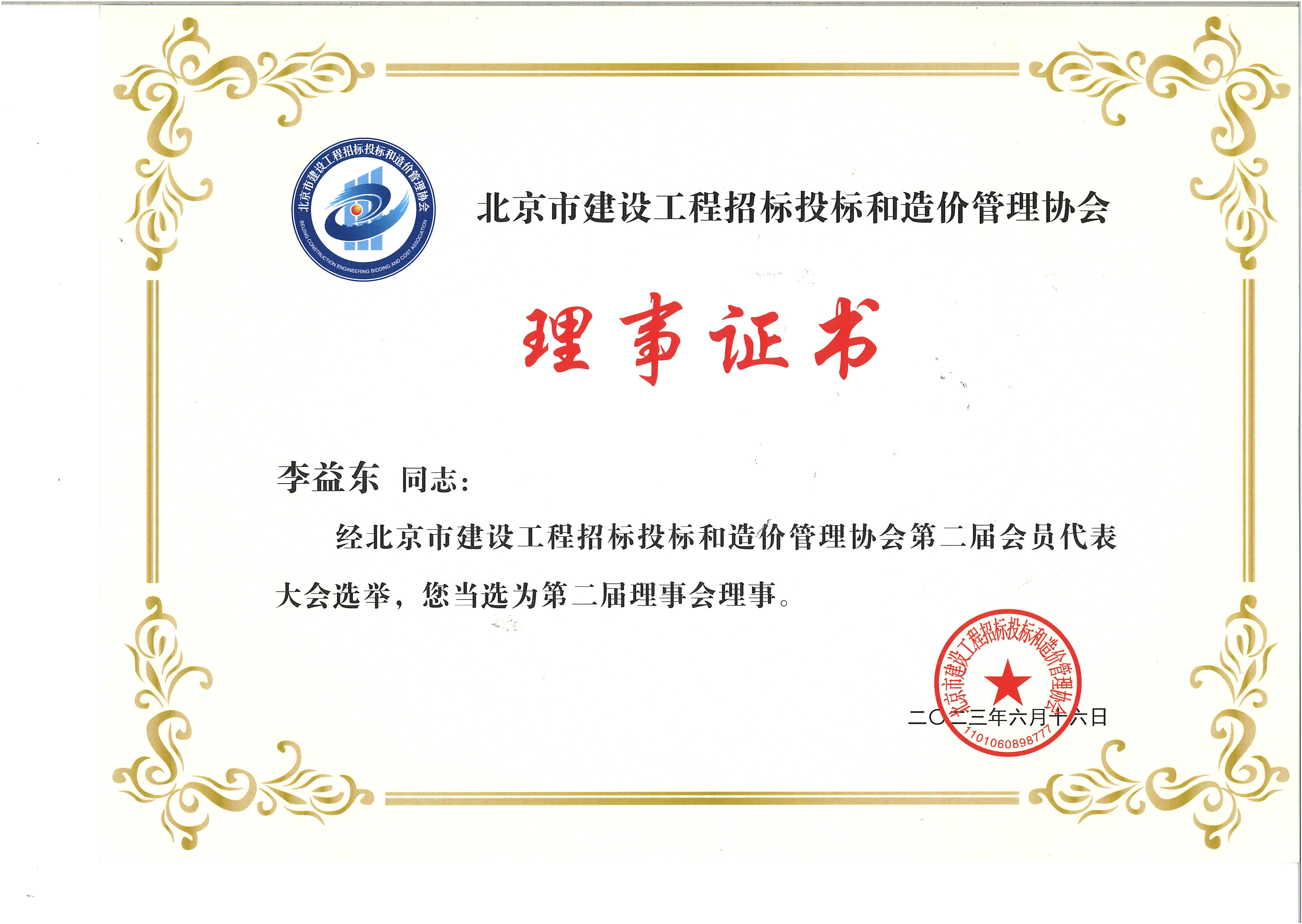 北京市建設工程招標投標和造價管理協(xié)會理事證書