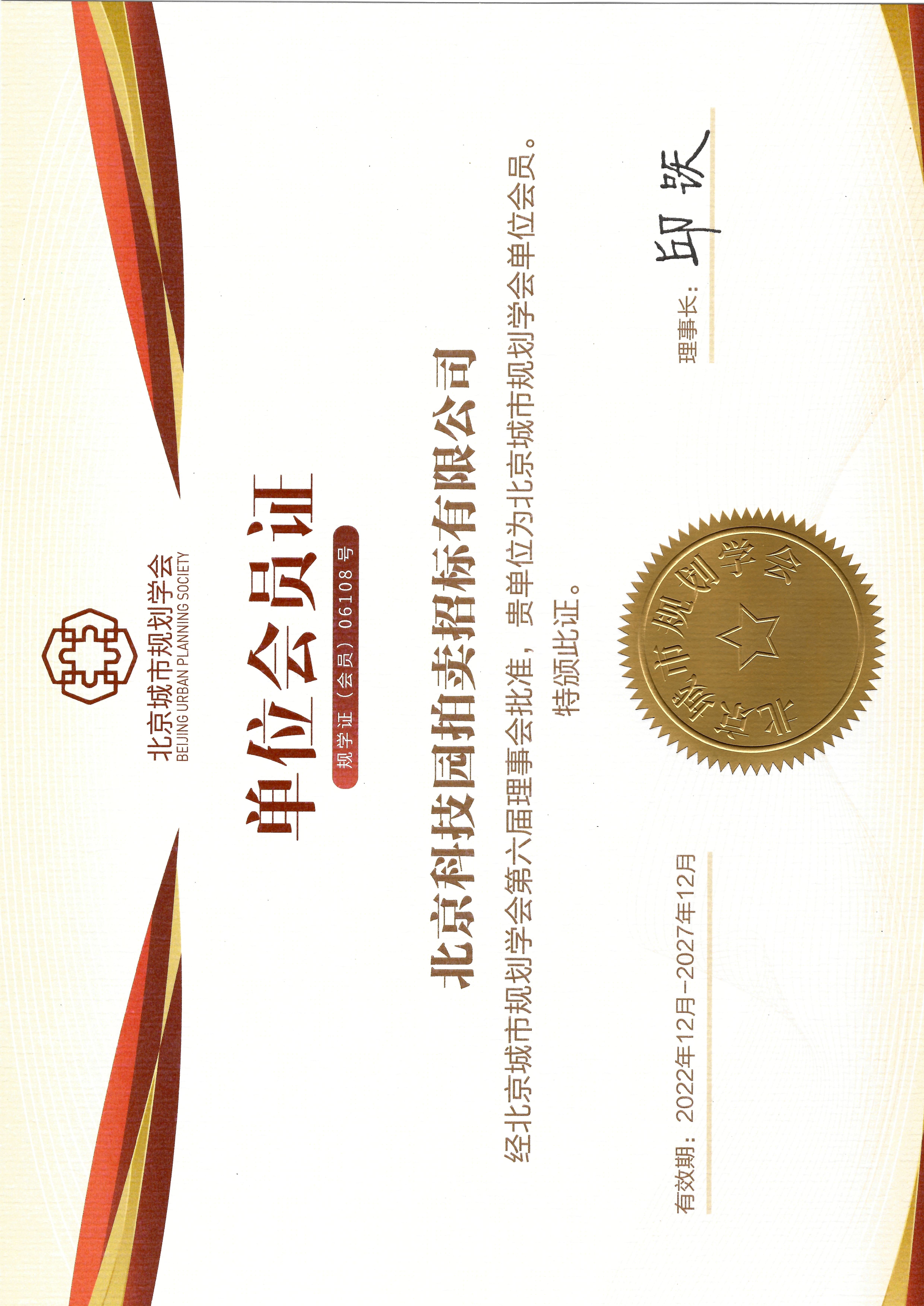 北京城市規(guī)劃學會單位會員證