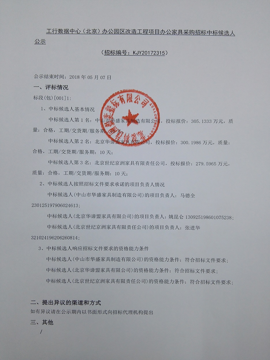 工行數(shù)據(jù)中心(北京)辦公園區(qū)改造工程項目辦公家具采購招標中標候選人公示