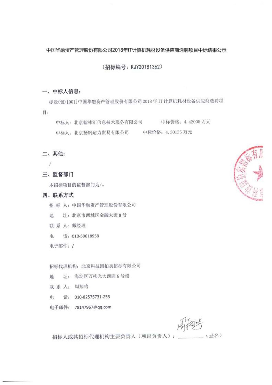 中國華融資產(chǎn)管理股份有限公司2018年IT計算機耗材設備供應商選聘項目中標結(jié)果公示